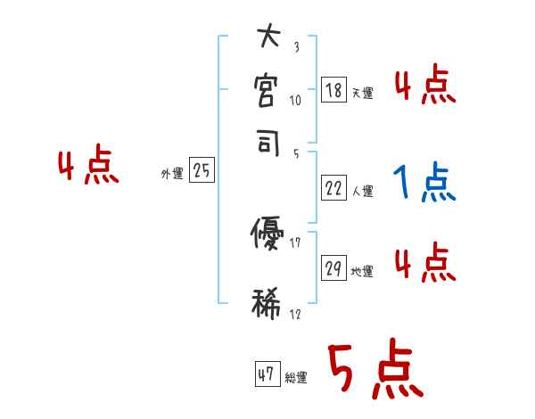 天運![]() | 大宮司優稀さんの天運は18画の4つ星!情熱的で剛気。忍耐力があり信頼される。 家系が持つ宿命的な運勢を表します。祖先から受け継いだ苗字ですので自分の力が及びません。家柄を象徴します。 |
