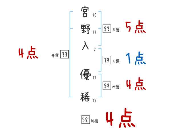 外運![]() | 宮野入優稀さんの外運は33画の4つ星!権力志向でプライドが高い。勇気があり運を切り開き成功する。 生活面を象徴する運勢です。外部から受ける影響力を表し、結婚運、家庭運や職場、環境への順応性を表します。 |
