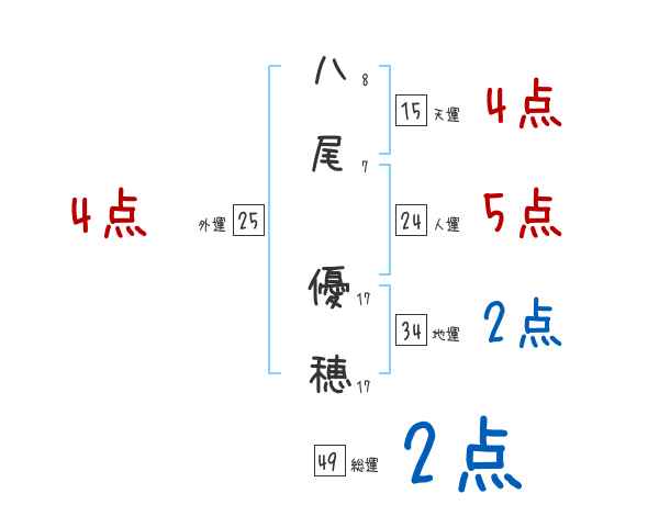 人運![]() | 八尾優穂さんの人運は24画の5つ星!家庭運が良く順調な人生。金運にも恵まれる。 性格や才能などを表す2番目に重要な運勢です。人間関係や協調性、社会的な成功に影響します。主に20歳から50歳ぐらいまでの中年期の運勢を表します。 |