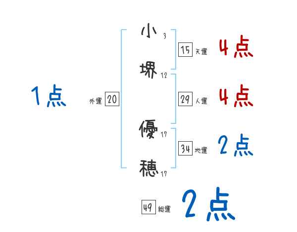 人運![]() | 小堺優穂さんの人運は29画の4つ星!完全主義で才能がある。厳格な心の持ち主。 性格や才能などを表す2番目に重要な運勢です。人間関係や協調性、社会的な成功に影響します。主に20歳から50歳ぐらいまでの中年期の運勢を表します。 |