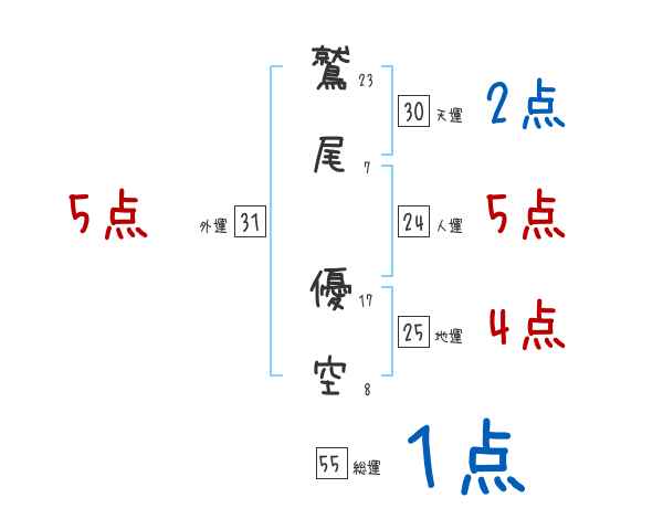 天運![]() | 鷲尾優空さんの天運は30画の2つ星!浮き沈みの激しさに注意しましょう。 家系が持つ宿命的な運勢を表します。祖先から受け継いだ苗字ですので自分の力が及びません。家柄を象徴します。 |