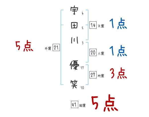 外運![]() | 宇田川優笑さんの外運は21画の5つ星!統率力がある。独立し成功する。名誉を手に入れる。 生活面を象徴する運勢です。外部から受ける影響力を表し、結婚運、家庭運や職場、環境への順応性を表します。 |