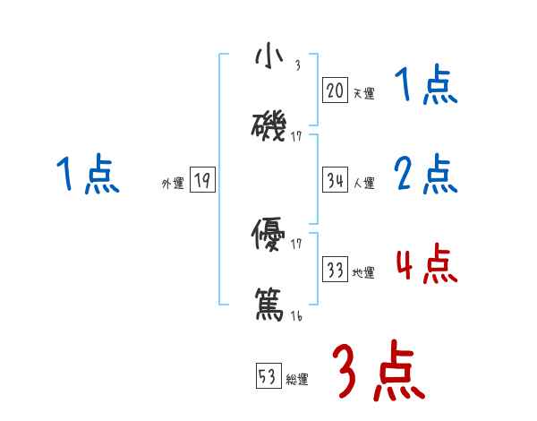 外運![]() | 小磯優篤さんの外運は19画の1つ星!優れた才能を持ちますが、協調性が足りないことも。周りの人と協力する事を意識しましょう。 生活面を象徴する運勢です。外部から受ける影響力を表し、結婚運、家庭運や職場、環境への順応性を表します。 |
