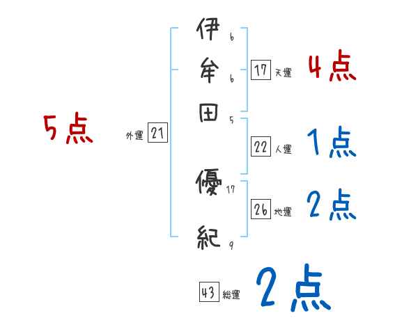 人運![]() | 伊牟田優紀さんの人運は22画の1つ星!努力することが苦手ないっぽう手先が器用。芸術性にも優れる。 性格や才能などを表す2番目に重要な運勢です。人間関係や協調性、社会的な成功に影響します。主に20歳から50歳ぐらいまでの中年期の運勢を表します。 |