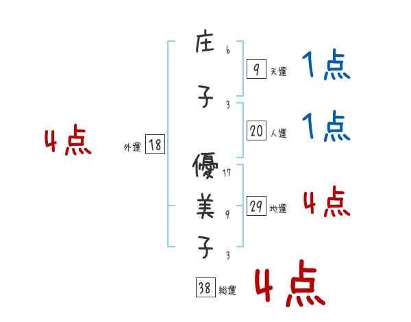 天運![]() | 庄子優美子さんの天運は9画の1つ星!消極的で才能を発揮することが苦手なことも。周りの意見に耳を傾けましょう。 家系が持つ宿命的な運勢を表します。祖先から受け継いだ苗字ですので自分の力が及びません。家柄を象徴します。 |