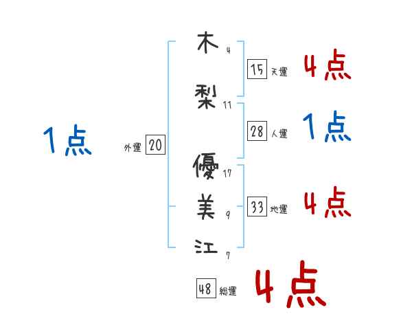 総運![]() | 木梨優美江さんの総運は48画の4つ星!賢明な性格で人望が厚い。指導力があり多くの人に尊敬される。 あなたの人生を表す1番重要な運勢です。生涯を通じて影響する総合運となり、主に50歳以降の晩年期に影響を及ぼします。 |
