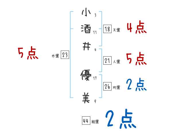 外運![]() | 小酒井優美さんの外運は23画の5つ星!想像力に優れ活力がある。一代で成功し名誉を手に入れる。 生活面を象徴する運勢です。外部から受ける影響力を表し、結婚運、家庭運や職場、環境への順応性を表します。 |