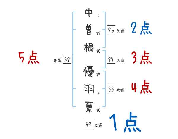 外運![]() | 中曽根優羽夏さんの外運は32画の5つ星!柔軟性があり成功する。チャンスが多く金運が良い。 生活面を象徴する運勢です。外部から受ける影響力を表し、結婚運、家庭運や職場、環境への順応性を表します。 |