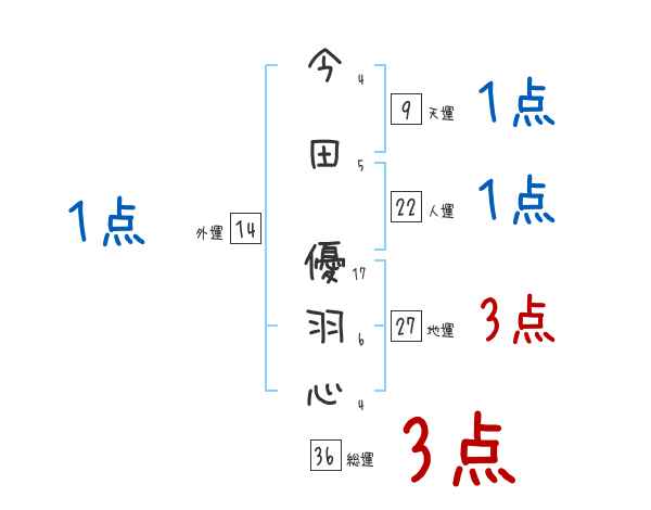外運![]() | 今田優羽心さんの外運は14画の1つ星!人に対して優しいがストレスを溜め込みがち。人間関係のトラブルを避けるよう気をつけましょう。 生活面を象徴する運勢です。外部から受ける影響力を表し、結婚運、家庭運や職場、環境への順応性を表します。 |
