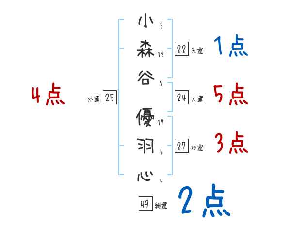 人運![]() | 小森谷優羽心さんの人運は24画の5つ星!家庭運が良く順調な人生。金運にも恵まれる。 性格や才能などを表す2番目に重要な運勢です。人間関係や協調性、社会的な成功に影響します。主に20歳から50歳ぐらいまでの中年期の運勢を表します。 |