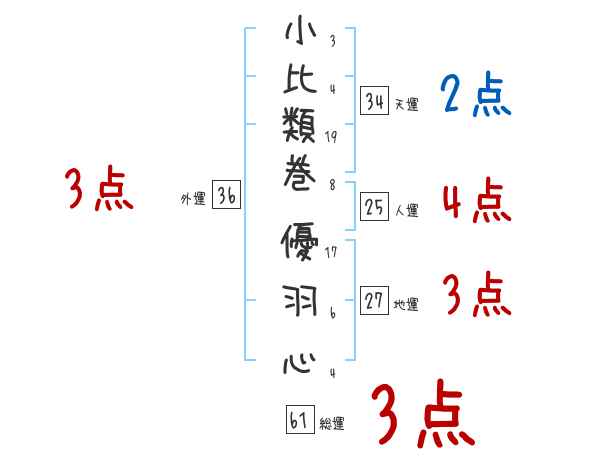 外運![]() | 小比類巻優羽心さんの外運は36画の3つ星!先見性が豊かです。多少神経質で苦労することも。 生活面を象徴する運勢です。外部から受ける影響力を表し、結婚運、家庭運や職場、環境への順応性を表します。 |
