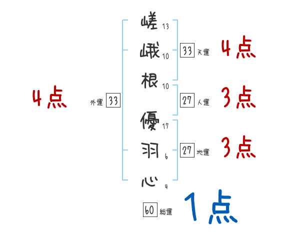 外運![]() | 嵯峨根優羽心さんの外運は33画の4つ星!権力志向でプライドが高い。勇気があり運を切り開き成功する。 生活面を象徴する運勢です。外部から受ける影響力を表し、結婚運、家庭運や職場、環境への順応性を表します。 |