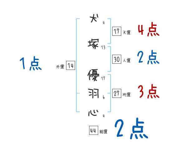| 外運  | 犬塚優羽心さんの外運は14画の1つ星!人に対して優しいがストレスを溜め込みがち。人間関係のトラブルを避けるよう気をつけましょう。生活面を象徴する運勢です。外部から受ける影響力を表し、結婚運、家庭運や職場、環境への順応性を表します。 |