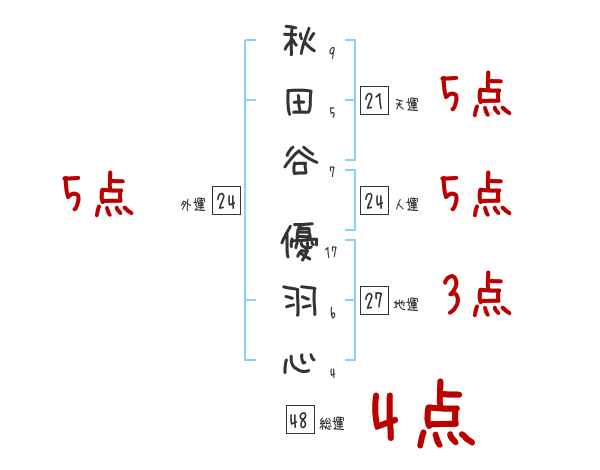 天運![]() | 秋田谷優羽心さんの天運は21画の5つ星!統率力がある。独立し成功する。名誉を手に入れる。 家系が持つ宿命的な運勢を表します。祖先から受け継いだ苗字ですので自分の力が及びません。家柄を象徴します。 |