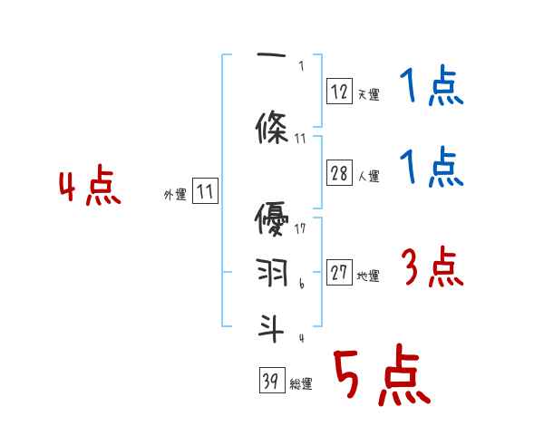 総運![]() | 一條優羽斗さんの総運は39画の5つ星!社交性に優れ人望が厚い。人の上に立ち成功する。 あなたの人生を表す1番重要な運勢です。生涯を通じて影響する総合運となり、主に50歳以降の晩年期に影響を及ぼします。 |