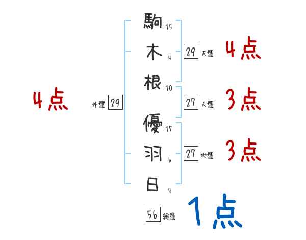 外運![]() | 駒木根優羽日さんの外運は29画の4つ星!完全主義で才能がある。厳格な心の持ち主。 生活面を象徴する運勢です。外部から受ける影響力を表し、結婚運、家庭運や職場、環境への順応性を表します。 |