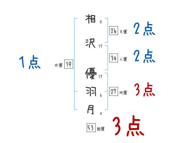 天運![]()  | 相沢優羽月さんの天運は26画の2つ星!波瀾万丈かも。信頼できる人を大事にしましょう。 家系が持つ宿命的な運勢を表します。祖先から受け継いだ苗字ですので自分の力が及びません。家柄を象徴します。 |