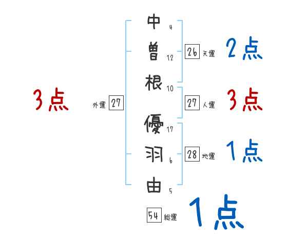 外運![]() | 中曽根優羽由さんの外運は27画の3つ星!頭脳明晰だが強情で摩擦が多い傾向。孤立に注意。 生活面を象徴する運勢です。外部から受ける影響力を表し、結婚運、家庭運や職場、環境への順応性を表します。 |