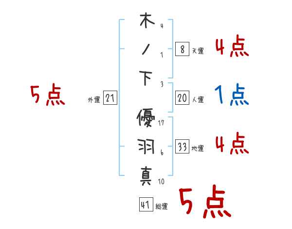外運![]() | 木ノ下優羽真さんの外運は21画の5つ星!統率力がある。独立し成功する。名誉を手に入れる。 生活面を象徴する運勢です。外部から受ける影響力を表し、結婚運、家庭運や職場、環境への順応性を表します。 |