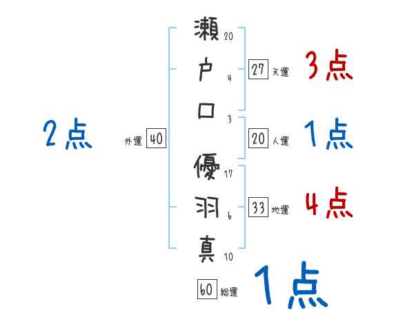 天運![]() | 瀬戸口優羽真さんの天運は27画の3つ星!頭脳明晰だが強情で摩擦が多い傾向。孤立に注意。 家系が持つ宿命的な運勢を表します。祖先から受け継いだ苗字ですので自分の力が及びません。家柄を象徴します。 |
