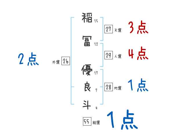 外運![]() | 稲冨優良斗さんの外運は26画の2つ星!波瀾万丈かも。信頼できる人を大事にしましょう。 生活面を象徴する運勢です。外部から受ける影響力を表し、結婚運、家庭運や職場、環境への順応性を表します。 |
