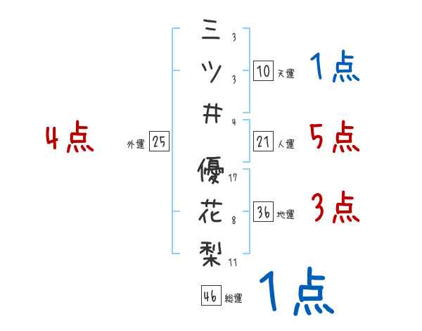 外運![]() | 三ツ井優花梨さんの外運は25画の4つ星!個性があり才能があふれる。強運の持ち主で発展する。 生活面を象徴する運勢です。外部から受ける影響力を表し、結婚運、家庭運や職場、環境への順応性を表します。 |