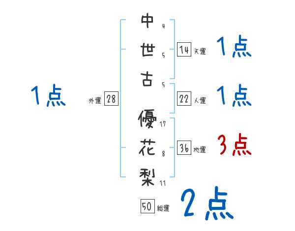天運![]() | 中世古優花梨さんの天運は14画の1つ星!人に対して優しいがストレスを溜め込みがち。人間関係のトラブルを避けるよう気をつけましょう。 家系が持つ宿命的な運勢を表します。祖先から受け継いだ苗字ですので自分の力が及びません。家柄を象徴します。 |