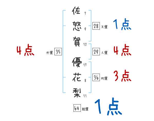 天運![]() | 佐怒賀優花梨さんの天運は28画の1つ星!家庭環境に注意。スポーツで活躍できる能力があるかも。 家系が持つ宿命的な運勢を表します。祖先から受け継いだ苗字ですので自分の力が及びません。家柄を象徴します。 |