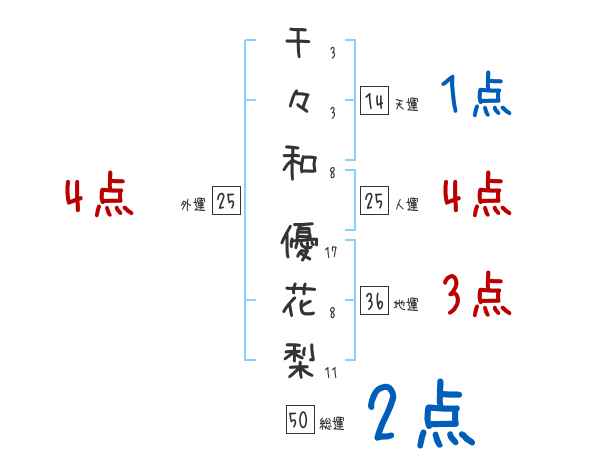 総運![]() | 千々和優花梨さんの総運は50画の2つ星!浮き沈みが激しく不安定。しりすぼみに衰退しやすいので注意しましょう。 あなたの人生を表す1番重要な運勢です。生涯を通じて影響する総合運となり、主に50歳以降の晩年期に影響を及ぼします。 |