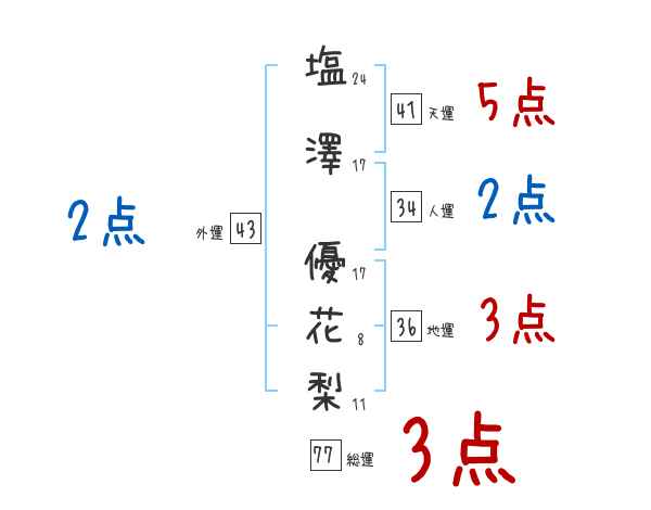 外運![]() | 塩澤優花梨さんの外運は43画の2つ星!頑固な性格で独立心が強いかも。やや非現実的で浪費に注意しましょう。 生活面を象徴する運勢です。外部から受ける影響力を表し、結婚運、家庭運や職場、環境への順応性を表します。 |