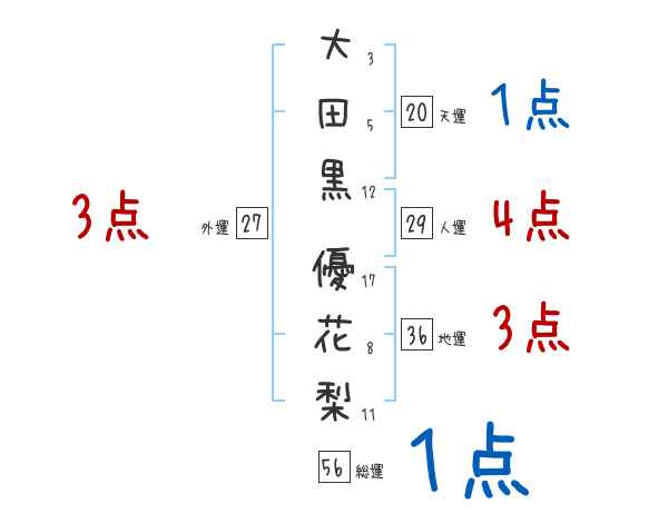 外運![]() | 大田黒優花梨さんの外運は27画の3つ星!頭脳明晰だが強情で摩擦が多い傾向。孤立に注意。 生活面を象徴する運勢です。外部から受ける影響力を表し、結婚運、家庭運や職場、環境への順応性を表します。 |