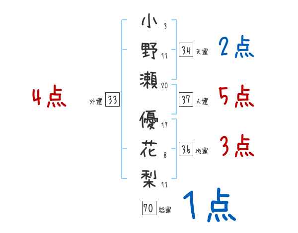 外運![]() | 小野瀬優花梨さんの外運は33画の4つ星!権力志向でプライドが高い。勇気があり運を切り開き成功する。 生活面を象徴する運勢です。外部から受ける影響力を表し、結婚運、家庭運や職場、環境への順応性を表します。 |