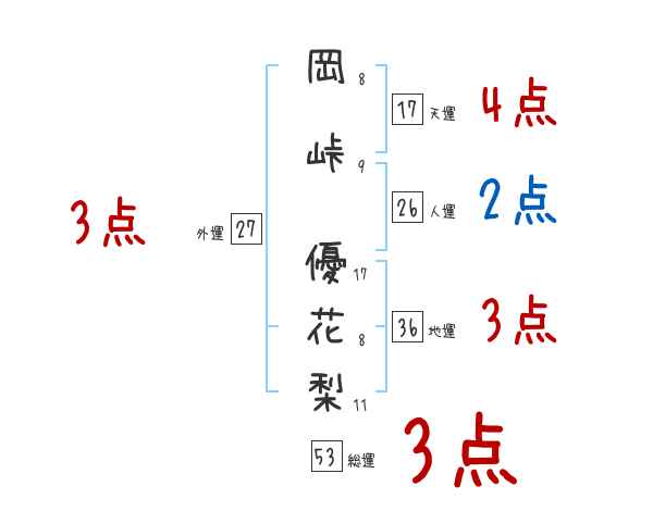 総運![]() | 岡峠優花梨さんの総運は53画の3つ星!やや見栄っ張りで虚栄心がある。散財に注意。 あなたの人生を表す1番重要な運勢です。生涯を通じて影響する総合運となり、主に50歳以降の晩年期に影響を及ぼします。 |