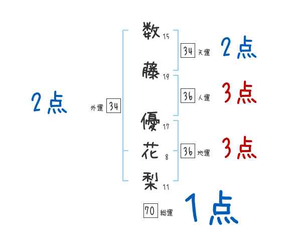 外運![]() | 数藤優花梨さんの外運は34画の2つ星!独創性に優れるが、自尊心が強く災難に注意しましょう。 生活面を象徴する運勢です。外部から受ける影響力を表し、結婚運、家庭運や職場、環境への順応性を表します。 |