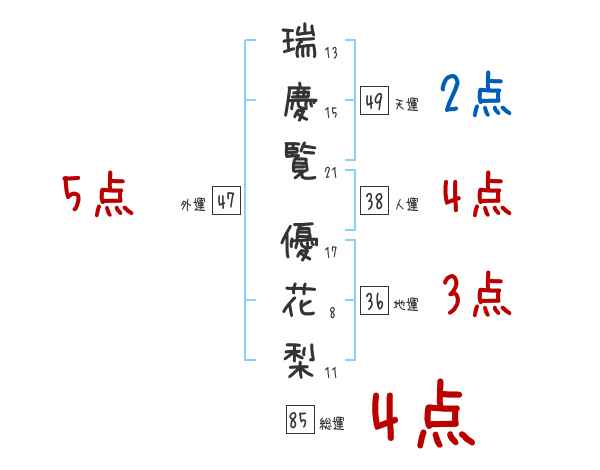外運![]() | 瑞慶覧優花梨さんの外運は47画の5つ星!実力が開花し発展する円満な人生。財に恵まれる。 生活面を象徴する運勢です。外部から受ける影響力を表し、結婚運、家庭運や職場、環境への順応性を表します。 |