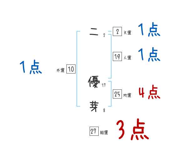 人運![]() | 二優芽さんの人運は19画の1つ星!優れた才能を持ちますが、協調性が足りないことも。周りの人と協力する事を意識しましょう。 性格や才能などを表す2番目に重要な運勢です。人間関係や協調性、社会的な成功に影響します。主に20歳から50歳ぐらいまでの中年期の運勢を表します。 |