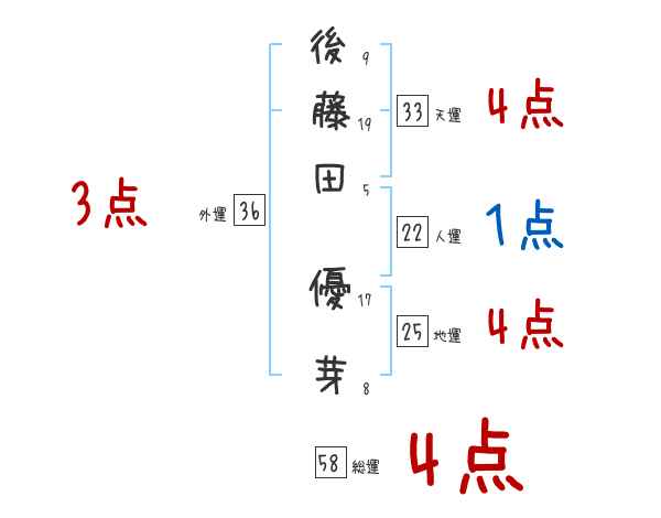 天運![]() | 後藤田優芽さんの天運は33画の4つ星!権力志向でプライドが高い。勇気があり運を切り開き成功する。 家系が持つ宿命的な運勢を表します。祖先から受け継いだ苗字ですので自分の力が及びません。家柄を象徴します。 |