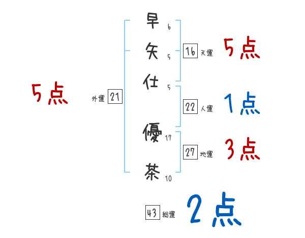天運![]() | 早矢仕優茶さんの天運は16画の5つ星!人望が厚く大きく発展する。逆転成功が見える。 家系が持つ宿命的な運勢を表します。祖先から受け継いだ苗字ですので自分の力が及びません。家柄を象徴します。 |
