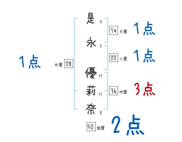 人運![]() | 是永優莉奈さんの人運は22画の1つ星!努力することが苦手ないっぽう手先が器用。芸術性にも優れる。 性格や才能などを表す2番目に重要な運勢です。人間関係や協調性、社会的な成功に影響します。主に20歳から50歳ぐらいまでの中年期の運勢を表します。 |