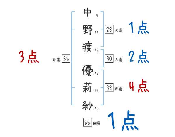 外運![]() | 中野渡優莉紗さんの外運は36画の3つ星!先見性が豊かです。多少神経質で苦労することも。 生活面を象徴する運勢です。外部から受ける影響力を表し、結婚運、家庭運や職場、環境への順応性を表します。 |