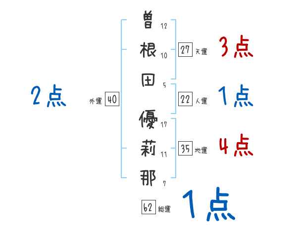 人運![]() | 曽根田優莉那さんの人運は22画の1つ星!努力することが苦手ないっぽう手先が器用。芸術性にも優れる。 性格や才能などを表す2番目に重要な運勢です。人間関係や協調性、社会的な成功に影響します。主に20歳から50歳ぐらいまでの中年期の運勢を表します。 |