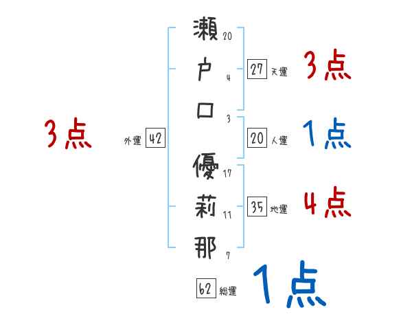 天運![]() | 瀬戸口優莉那さんの天運は27画の3つ星!頭脳明晰だが強情で摩擦が多い傾向。孤立に注意。 家系が持つ宿命的な運勢を表します。祖先から受け継いだ苗字ですので自分の力が及びません。家柄を象徴します。 |