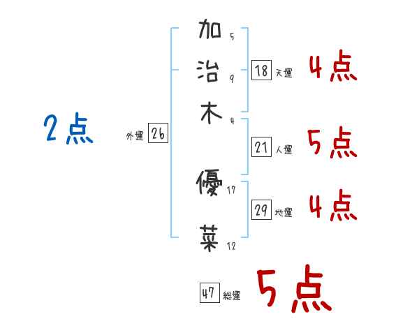 外運![]() | 加治木優菜さんの外運は26画の2つ星!波瀾万丈かも。信頼できる人を大事にしましょう。 生活面を象徴する運勢です。外部から受ける影響力を表し、結婚運、家庭運や職場、環境への順応性を表します。 |