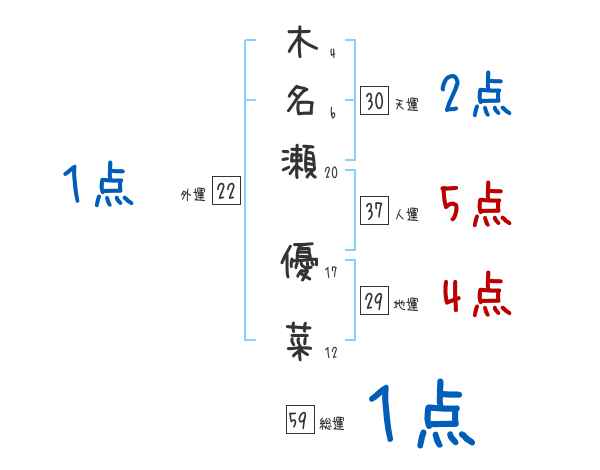 天運![]() | 木名瀬優菜さんの天運は30画の2つ星!浮き沈みの激しさに注意しましょう。 家系が持つ宿命的な運勢を表します。祖先から受け継いだ苗字ですので自分の力が及びません。家柄を象徴します。 |
