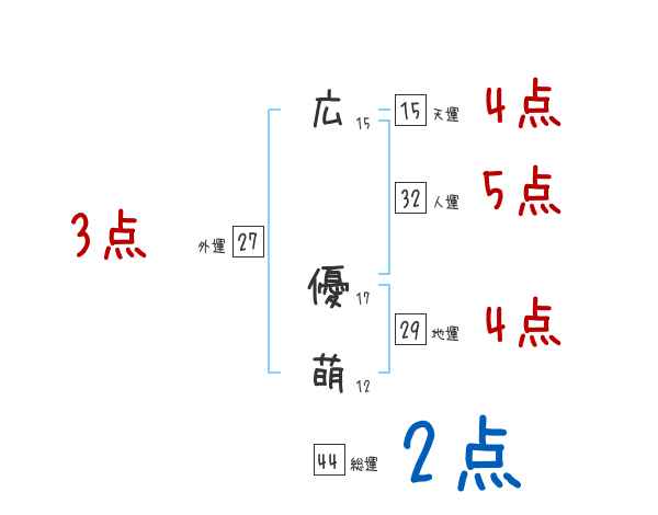 人運![]() | 広優萌さんの人運は32画の5つ星!柔軟性があり成功する。チャンスが多く金運が良い。 性格や才能などを表す2番目に重要な運勢です。人間関係や協調性、社会的な成功に影響します。主に20歳から50歳ぐらいまでの中年期の運勢を表します。 |