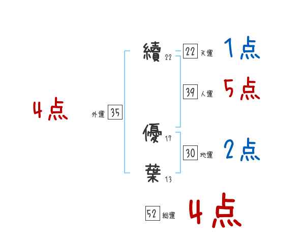 外運![]() | 續優葉さんの外運は35画の4つ星!温厚な性格で感受性が高い。穏和な性格で人望が厚い。 生活面を象徴する運勢です。外部から受ける影響力を表し、結婚運、家庭運や職場、環境への順応性を表します。 |