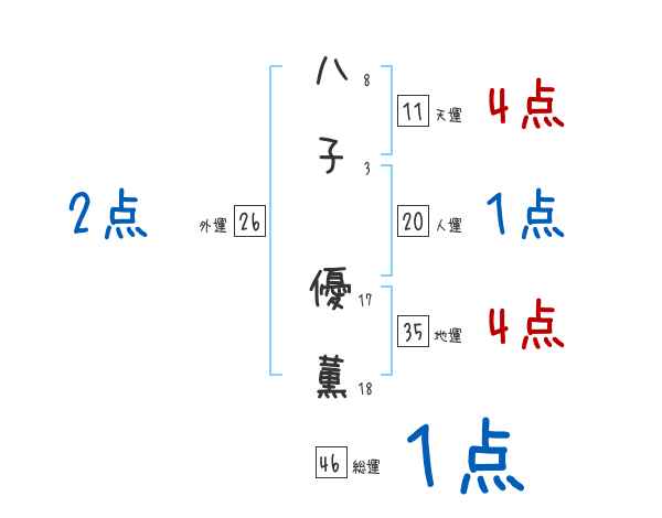 外運![]() | 八子優薫さんの外運は26画の2つ星!波瀾万丈かも。信頼できる人を大事にしましょう。 生活面を象徴する運勢です。外部から受ける影響力を表し、結婚運、家庭運や職場、環境への順応性を表します。 |