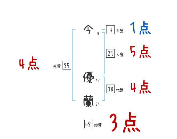 人運![]() | 今優蘭さんの人運は21画の5つ星!統率力がある。独立し成功する。名誉を手に入れる。 性格や才能などを表す2番目に重要な運勢です。人間関係や協調性、社会的な成功に影響します。主に20歳から50歳ぐらいまでの中年期の運勢を表します。 |