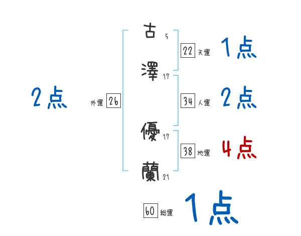 天運![]() | 古澤優蘭さんの天運は22画の1つ星!努力することが苦手ないっぽう手先が器用。芸術性にも優れる。 家系が持つ宿命的な運勢を表します。祖先から受け継いだ苗字ですので自分の力が及びません。家柄を象徴します。 |