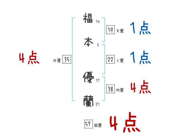 外運![]() | 福本優蘭さんの外運は35画の4つ星!温厚な性格で感受性が高い。穏和な性格で人望が厚い。 生活面を象徴する運勢です。外部から受ける影響力を表し、結婚運、家庭運や職場、環境への順応性を表します。 |